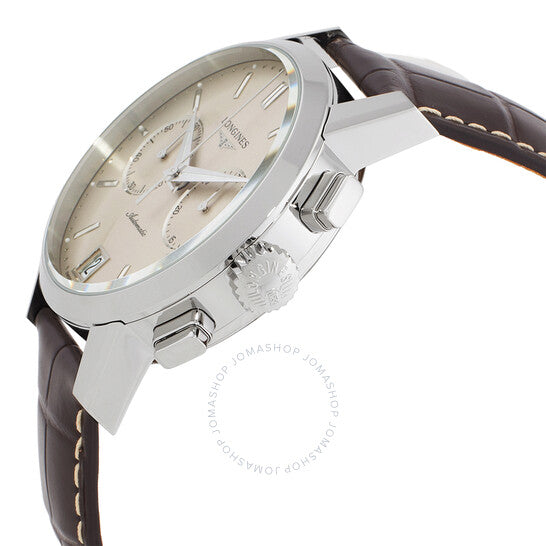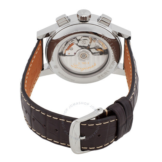علبة فضية اللون من الفولاذ المقاوم للصدأ مع سوار جلدي بني. إطار ثابت فضي اللون من الفولاذ المقاوم للصدأ. ميناء بيج مع عقارب فضية اللون وعلامات ساعات. علامات دقائق حول الحافة الخارجية. نوع الميناء: تناظري. عرض التاريخ عند موضع الساعة السادسة. كرونوغراف - ميناءان فرعيان يعرضان: 60 ثانية و30 دقيقة. حركة أوتوماتيكية. زجاج ياقوت مقاوم للخدش. غطاء خلفي شفاف. شكل العلبة دائري، مقاسها 42 مم. مقاومة للماء حتى عمق 30 مترًا / 100 قدم. الوظائف: كرونوغراف، تاريخ، ساعة، دقيقة، ثانية. سلسلة 1832. تصميم ساعة كاجوال. علامة الساعة: صناعة سويسرية. ساعة لونجين 1832 كرونوغراف أوتوماتيكية للرجال بمينا بيج، رقمها L48294922.