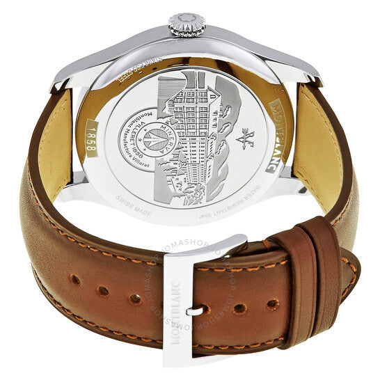 علبة من الفولاذ المقاوم للصدأ مع سوار من جلد العجل الإيطالي المحبب بالكامل باللون البني. إطار ثابت من الفولاذ المقاوم للصدأ. ميناء أسود بعقارب مضيئة على شكل كاتدرائية مطلية بالروديوم وعلامات ساعات رقمية عربية. علامات دقائق رقمية عربية (بفاصل 5 دقائق). علامات دقائق حول الحافة الخارجية. نوع الميناء: تناظري. عقارب وعلامات مضيئة. ميناء فرعي واحد يعرض: ثوانٍ صغيرة. حركة أوتوماتيكية من مونت بلانك، عيار MB 24.16، مبنية على سيليتا SW260-1، تحتوي على 31 جوهرة، تنبض بمعدل 28800 ذبذبة في الساعة، ولديها احتياطي طاقة لمدة 38 ساعة تقريبًا. زجاج ياقوت مقاوم للخدش. تاج قابل للسحب/الدفع. غطاء خلفي صلب. شكل دائري. حجم الهيكل: 47 مم. سمك الهيكل: 12.2 مم. عرض السوار: 22 مم. مشبك تانغ. مقاومة للماء حتى عمق 30 مترًا / 100 قدم. الوظائف: الساعات، الدقائق، الثواني. سلسلة ١٨٥٨. تصميم فاخر. علامة الساعة: صناعة سويسرية. ساعة مونت بلانك ١٨٥٨ أوتوماتيكية للرجال بمينا أسود ١١٥٠٧٣.