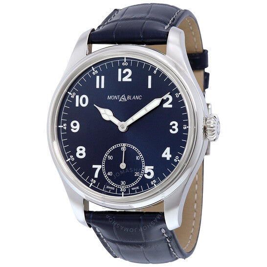 علبة من الفولاذ المقاوم للصدأ مع سوار أزرق من جلد التمساح. إطار ثابت من الفولاذ المقاوم للصدأ. ميناء أزرق بعقارب فضية اللون وعلامات ساعات بأرقام عربية. علامات دقائق حول الحافة الخارجية. نوع الميناء: تناظري. ميناء فرعي للثواني الصغيرة. حركة مون بلان عيار MB 23.03 يدوية التعبئة مع احتياطي طاقة لمدة 46 ساعة. زجاج من الياقوت المقاوم للخدش. تاج قابل للسحب/الدفع. غطاء خلفي شفاف. حجم العلبة: 44 مم. سمكها: 10.95 مم. شكلها دائري. عرض السوار: 20 مم. مشبك تانغ. مقاومة للماء حتى عمق 30 مترًا / 100 قدم. الوظائف: الساعات، الدقائق، الثواني. تصميم ساعة فاخرة. علامة الساعة: صناعة سويسرية. ساعة مون بلان 1858 للرجال بمينا أزرق وجلد أزرق، رقم 113702.