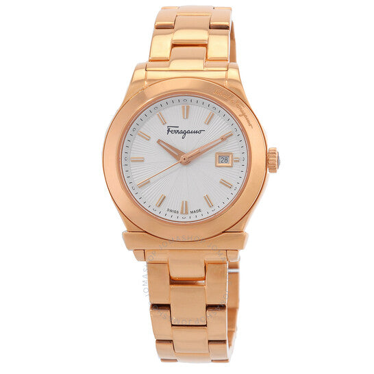 علبة وسوار من الفولاذ المقاوم للصدأ بلون الذهب الوردي. إطار ثابت من الفولاذ المقاوم للصدأ بلون الذهب الوردي. ميناء فضي مع عقارب وعلامات ساعات ذهبية وردية. علامات دقائق حول الحافة الخارجية. نوع الميناء: تناظري. عقارب وعلامات مضيئة. عرض التاريخ عند موضع الساعة 3. حركة كوارتز. زجاج ياقوتي مقاوم للخدش. تاج قابل للسحب/الدفع. غطاء خلفي صلب. شكل دائري، مقاس العلبة: 33 مم. مشبك فراشة. مقاومة للماء حتى عمق 50 مترًا / 165 قدمًا. الوظائف: التاريخ، الساعة، الدقائق، الثواني. سلسلة 1898. تصميم ساعة كاجوال. علامة الساعة: صناعة سويسرية. ساعة فيراغامو 1898 كوارتز نسائية بمينا فضي FF3180014.