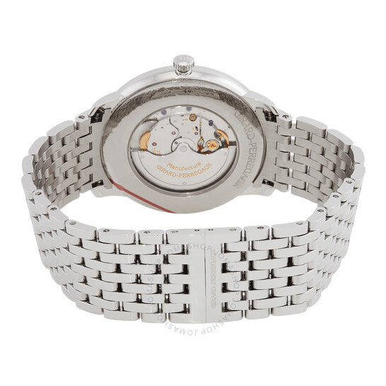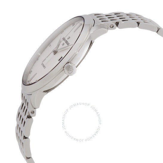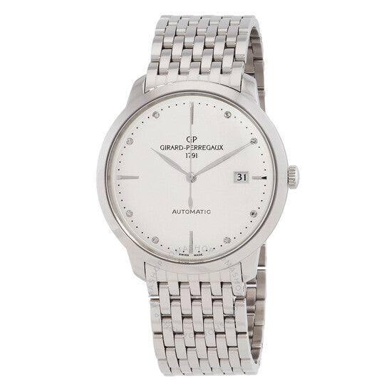 علبة وسوار من الفولاذ المقاوم للصدأ فضي اللون. إطار ثابت من الفولاذ المقاوم للصدأ فضي اللون. ميناء فضي اللون مع عقارب وعلامات ساعات فضية اللون. علامات دقائق حول الحافة الخارجية. نوع الميناء: تناظري. عرض التاريخ عند موضع الساعة 3. حركة أوتوماتيكية GP03300. زجاج ياقوت مقاوم للخدش. تاج قابل للسحب/الدفع. غطاء خلفي شفاف. شكل العلبة دائري، مقاس العلبة: 40 مم، سمكها: 8.9 مم. عرض السوار: 20 مم، طوله: 7 بوصات. مشبك قابل للطي مع مفتاح أمان. مقاومة للماء حتى عمق 30 مترًا / 100 قدم. الوظائف: التاريخ، الساعة، الدقيقة، الثانية. معلومات إضافية: الثواني المركزية، التاريخ، الساعات والدقائق. سلسلة 1966. طراز ساعة فاخرة. علامة الساعة: صناعة سويسرية. ساعة جيرارد بيريجو 1966 أوتوماتيكية نسائية بمينا فضي 49555-11-1A1-11A.