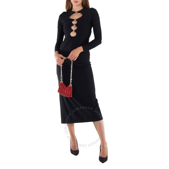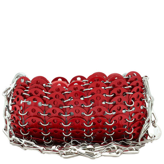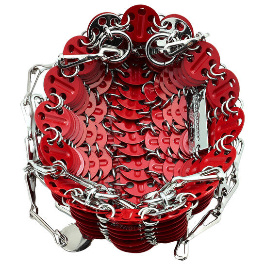 حقيبة كتف نسائية من باكو رابان. رمز المنتج: 23PSS0127MET421. اللون: أحمر. المقاس: الارتفاع 3.9 بوصة × العرض 6.1 بوصة × العمق 0.7 بوصة. حقيبة كتف باكو رابان 1969 شانميل. تتميز هذه الحقيبة بهيكل نحاسي بتأثير سلسلة بريدية، وجزء علوي مفتوح، وجيب رئيسي، وحزام كتف قابل للفصل. الخامة الخارجية: نحاس 100%.