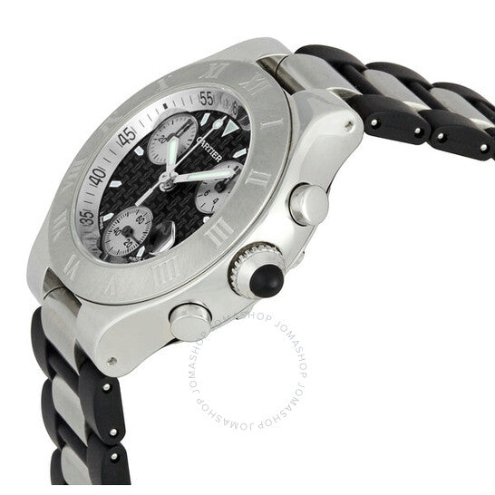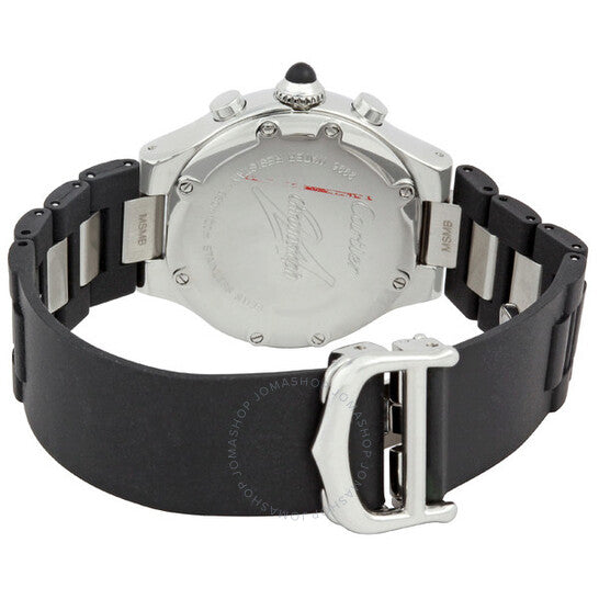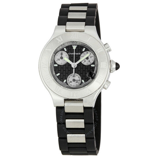 علبة من الفولاذ المقاوم للصدأ مع سوار مطاطي أسود بوصلات من الفولاذ المقاوم للصدأ. إطار ثابت من الفولاذ المقاوم للصدأ محفور بأرقام رومانية. ميناء أسود بعقارب مضيئة وعلامات ساعات مؤشرية. علامات دقائق على الحافة الخارجية. نافذة عرض التاريخ مكبرة عند موضع الساعة الرابعة. كرونوغراف - ثلاثة موانئ فرعية فضية تعرض: 60 ثانية، 30 دقيقة، وعُشر الثانية. حركة كرونوغراف كوارتز. كريستال ياقوت مقاوم للخدش. تاج مطاطي أسود مرصع بحجر كابوشون. غطاء خلفي من الفولاذ المقاوم للصدأ ببراغي. قطر العلبة: 32 مم. سمكها: 9.73 مم. مشبك قابل للطي. مقاومة للماء حتى عمق 100 متر / 330 قدمًا. ساعة كارتييه 21 كرونوسكاف النسائية W10198U2.