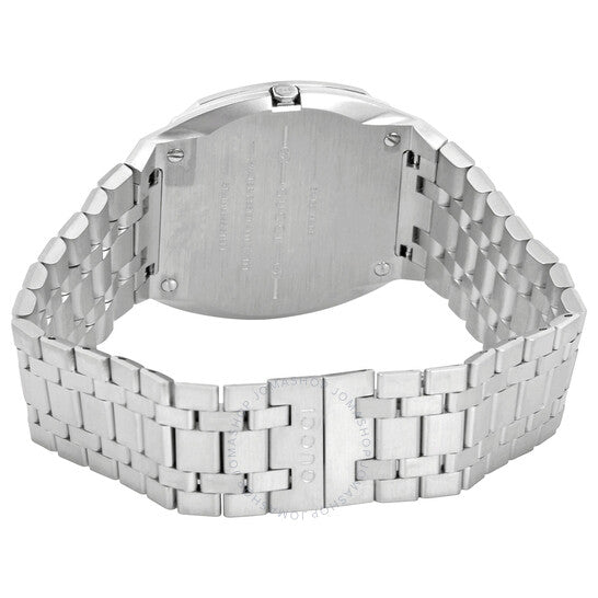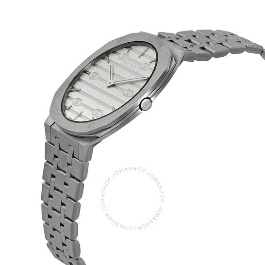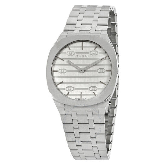 علبة وسوار من الفولاذ المقاوم للصدأ فضي اللون. إطار ثابت من الفولاذ المقاوم للصدأ فضي اللون. ميناء فضي اللون مع عقارب هيكلية فضية اللون وعلامات ساعات. نوع الميناء: تناظري. حركة كوارتز. زجاج ياقوت مقاوم للخدش. غطاء خلفي صلب. شكل العلبة: تونيو، مقاس العلبة: ٣٤ مم. عرض السوار: ٢٥ مم. مشبك قابل للطي. مقاومة للماء حتى عمق ٣٠ مترًا / ١٠٠ قدم. الوظائف: الساعات، الدقائق، سلسلة ٢٥ ساعة. تصميم كاجوال. علامة الساعة: صناعة سويسرية. ساعة غوتشي ٢٥ ساعة كوارتز نسائية بمينا فضي، YA163402.