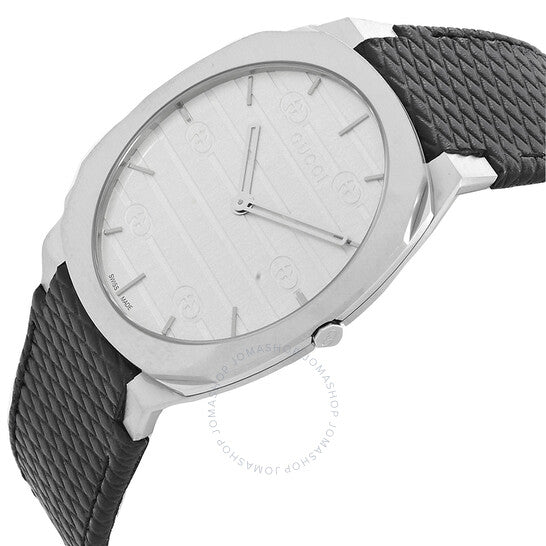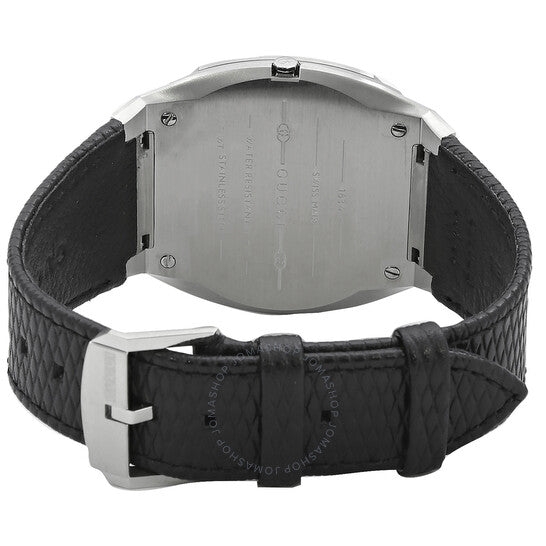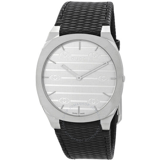 علبة من الفولاذ المقاوم للصدأ فضية اللون مع سوار جلدي أسود. إطار ثابت من الفولاذ المقاوم للصدأ فضي اللون. ميناء فضي اللون مع عقارب ومؤشرات ساعات فضية اللون. نوع الميناء: تناظري. حركة كوارتز. زجاج ياقوتي مقاوم للخدش. تاج قابل للسحب/الدفع. غطاء خلفي صلب. شكل العلبة وسادة، مقاسها: 38 مم. مشبك تانغ. مقاومة للماء حتى عمق 30 مترًا / 100 قدم. الوظائف: الساعات، الدقائق، سلسلة 25 ساعة. تصميم كاجوال. علامة الساعة: صناعة سويسرية. ساعة غوتشي 25 ساعة كوارتز نسائية بمينا فضي، YA163419.