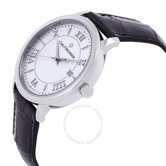 علبة فضية اللون من الفولاذ المقاوم للصدأ مع سوار أسود من جلد التمساح. إطار ثابت من الفولاذ المقاوم للصدأ فضي اللون. ميناء فضي اللون بعقارب فضية اللون وعلامات ساعات بأرقام رومانية. علامات دقائق حول الحافة الخارجية. نوع الميناء: تناظري. عرض التاريخ عند موضع الساعة 3. حركة أوتوماتيكية من كارل إف. بوخرير كاليبر CFB 1950، تحتوي على 26 جوهرة، تنبض بمعدل 28800 ذبذبة في الساعة، ولديها احتياطي طاقة يدوم حوالي 38 ساعة. زجاج من الياقوت المقاوم للخدش. تاج قابل للسحب/الدفع. شكل العلبة دائري، حجمها 39 مم. مقاومة للماء حتى عمق 30 مترًا / 100 قدم. الوظائف: التاريخ، الساعة، الدقيقة، الثانية. سلسلة أدامافي. تصميم ساعة فاخرة. علامة الساعة: صناعة سويسرية. تنوعات المنتج: 166.301.4. ساعة كارل إف. بوخرير أدامافي أوتوماتيكية للرجال 00.10314.08.15.01.