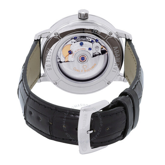 علبة فضية اللون من الفولاذ المقاوم للصدأ مع سوار أسود من جلد التمساح. إطار ثابت من الفولاذ المقاوم للصدأ فضي اللون. ميناء فضي اللون بعقارب فضية اللون وعلامات ساعات بأرقام رومانية. علامات دقائق حول الحافة الخارجية. نوع الميناء: تناظري. عرض التاريخ عند موضع الساعة 3. حركة أوتوماتيكية من كارل إف. بوخرير كاليبر CFB 1950، تحتوي على 26 جوهرة، تنبض بمعدل 28800 ذبذبة في الساعة، ولديها احتياطي طاقة يدوم حوالي 38 ساعة. زجاج من الياقوت المقاوم للخدش. تاج قابل للسحب/الدفع. شكل العلبة دائري، حجمها 39 مم. مقاومة للماء حتى عمق 30 مترًا / 100 قدم. الوظائف: التاريخ، الساعة، الدقيقة، الثانية. سلسلة أدامافي. تصميم ساعة فاخرة. علامة الساعة: صناعة سويسرية. تنوعات المنتج: 166.301.4. ساعة كارل إف. بوخرير أدامافي أوتوماتيكية للرجال 00.10314.08.15.01.