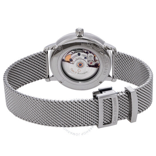 علبة من الفولاذ المقاوم للصدأ مع سوار شبكي ميلانو من الفولاذ المقاوم للصدأ. إطار ثابت من الفولاذ المقاوم للصدأ. ميناء أزرق بعقارب فضية اللون وعلامات ساعات. علامات دقائق حول الحافة الخارجية. نوع الميناء: تناظري. عرض التاريخ عند موضع الساعة 3. حركة أوتوماتيكية من كارل إف. بوخرير، عيار CFB 1950، تحتوي على 26 جوهرة، تنبض بمعدل 28800 ذبذبة في الساعة، ولديها احتياطي طاقة يدوم حوالي 38 ساعة. زجاج من الياقوت المقاوم للخدش. غطاء خلفي شفاف. شكل دائري. حجم العلبة: 39 مم. سمكها: 8.77 مم. مشبك قابل للطي. مقاومة للماء حتى عمق 30 مترًا / 100 قدم. الوظائف: التاريخ، الساعة، الدقيقة، الثانية. سلسلة أدامافي. تصميم ساعة فاخرة. علامة الساعة: صناعة سويسرية. ساعة كارل إف. بوخرير أدامافي أوتوماتيكية للرجال بمينا أزرق، 00.10314.08.53.21.