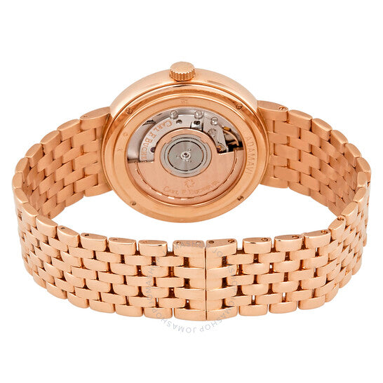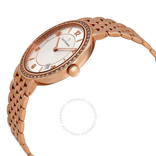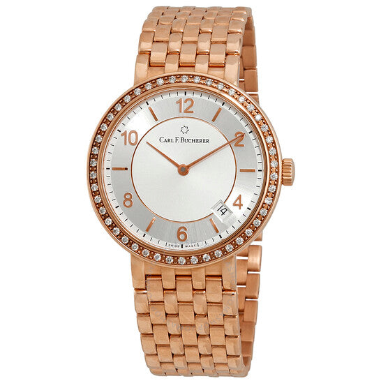 علبة من الذهب الوردي عيار ١٨ قيراطًا مع سوار من الذهب الوردي عيار ١٨ قيراطًا. إطار ثابت من الذهب الوردي عيار ١٨ قيراطًا مرصع بالألماس. ميناء فضي بعقارب بلون الذهب الوردي، وأرقام عربية وعلامات ساعات متناوبة. علامات دقائق حول الحافة الخارجية. نوع الميناء: تناظري. عرض التاريخ بين موضعي الساعة الخامسة والخامسة. حركة أوتوماتيكية مع احتياطي طاقة لمدة ٤٢ ساعة. زجاج ياقوت مقاوم للخدش. تاج قابل للسحب/الدفع. غطاء خلفي شفاف. شكل دائري. حجم العلبة: ٣٦ مم. سُمكها: ٨ مم. مقاومة للماء حتى عمق ٣٠ مترًا / ١٠٠ قدم. الوظائف: التاريخ، الساعة، الدقائق. طراز ساعة فاخرة. علامة الساعة: صناعة سويسرية. رقم الصنف: ١٦٩.٢٥٦.٨. ساعة كارل إف. بوخرير أدامافي أوتوماتيكية نسائية بمينا فضي مرصعة بالألماس ٠٠.١٠٣٠٧.٠٣.١٦.٣١.