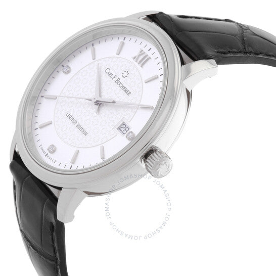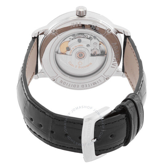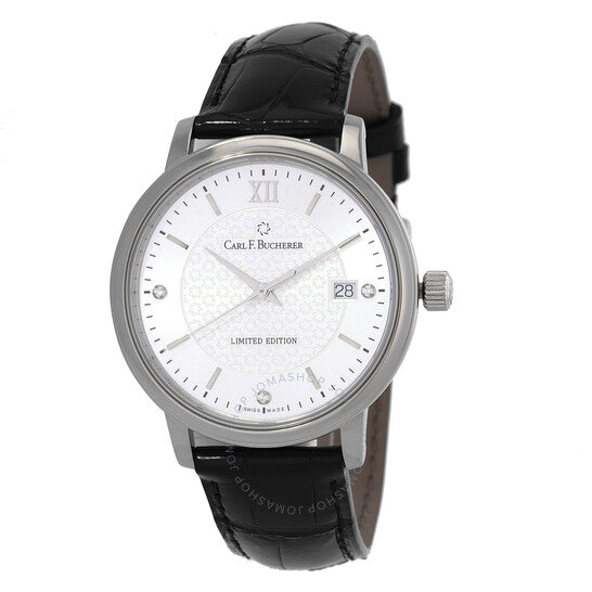 علبة فضية اللون من الفولاذ المقاوم للصدأ مع سوار أسود من جلد التمساح. إطار ثابت من الفولاذ المقاوم للصدأ فضي اللون. ميناء فضي اللون بعقارب فضية اللون وعلامات ساعات رومانية مرصعة بالألماس. علامات دقائق حول الحافة الخارجية. نوع الميناء: تناظري. عرض التاريخ عند موضع الساعة 3. حركة أوتوماتيكية من كارل إف. بوخرير كاليبر CFB 1950، تحتوي على 26 جوهرة، تنبض بمعدل 28800 ذبذبة في الساعة، ولديها احتياطي طاقة لمدة 38 ساعة تقريبًا. زجاج من الياقوت المقاوم للخدش. تاج قابل للسحب/الدفع. غطاء خلفي شفاف. شكل دائري، حجم العلبة: 39 مم. مشبك تانغ. مقاومة للماء حتى عمق 30 مترًا / 100 قدم. الوظائف: التاريخ، الساعة، الدقيقة، الثانية. سلسلة أدامافي. تصميم ساعة فاخرة. علامة الساعة: صناعة سويسرية. ساعة كارل إف. بوخرير أدامافي أوتوماتيكية للرجال بمينا فضي مرصع بالألماس 00.10314.08.19.99.