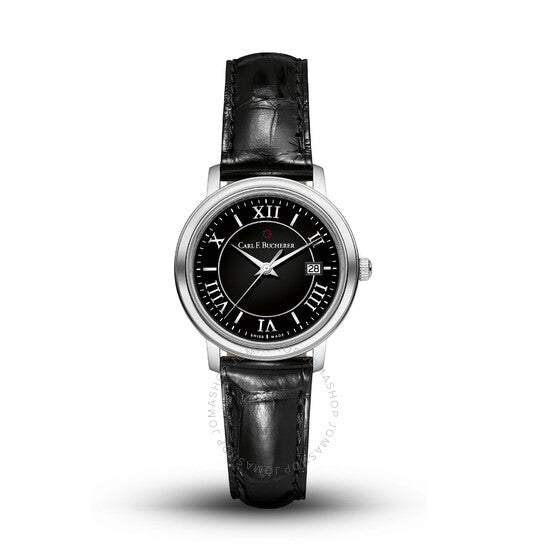 علبة من الفولاذ المقاوم للصدأ فضية اللون مع سوار أسود من جلد التمساح. إطار ثابت فضي اللون. ميناء أسود بعقارب فضية اللون وعلامات ساعات رومانية. نوع الميناء: تناظري. عرض التاريخ عند موضع الساعة 3. حركة كوارتز كارل إف. بوخرر كاليبر CFB 1853. زجاج ياقوتي مقاوم للخدش. غطاء خلفي صلب. شكل العلبة دائري، مقاسها 28 مم. مشبك بإبزيم. مقاومة للماء حتى عمق 30 مترًا / 100 قدم. الوظائف: التاريخ، الساعة، الدقيقة، الثانية. سلسلة أدامافي. تصميم ساعة فاخر. علامة الساعة: صناعة سويسرية. ساعة كارل إف. بوخرر أدامافي كوارتز نسائية بمينا سوداء، 00.10315.08.35.01.
