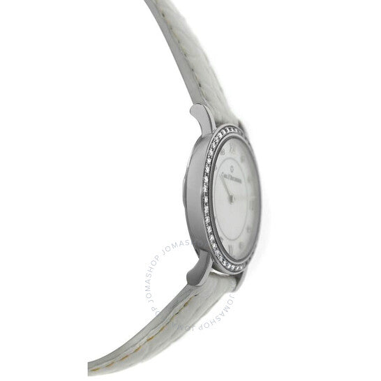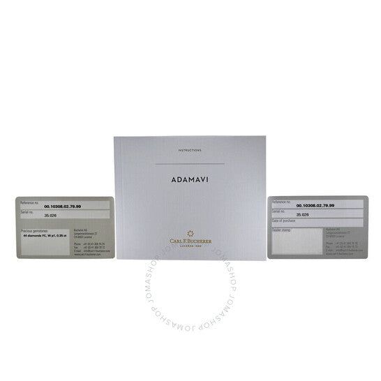 علبة من الذهب الأبيض عيار ١٨ قيراطًا مع سوار من الجلد الأبيض. إطار ثابت مرصع بالألماس من الذهب الأبيض عيار ١٨ قيراطًا. ميناء من عرق اللؤلؤ مع عقارب فضية اللون وعلامات ساعات من الألماس. نوع الميناء: تناظري. حركة كوارتز. حجم العلبة: ٢٦ مم. مشبك بإبزيم. الوظائف: الساعات والدقائق. سلسلة أدامافي. تصميم ساعة فاخر. علامة الساعة: صناعة سويسرية. ساعة كارل إف. بوخرير أدامافي كوارتز نسائية مرصعة بالألماس ٠٠.١٠٣٠٨.٠٢.٧٩.٩٩/W.