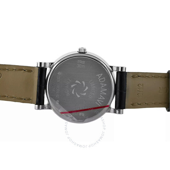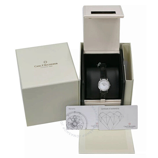 علبة من الذهب الأبيض عيار ١٨ قيراطًا مع سوار جلدي أسود. إطار ثابت مرصع بالألماس من الذهب الأبيض عيار ١٨ قيراطًا. ميناء من عرق اللؤلؤ مع عقارب فضية اللون وعلامات ساعات من الألماس. نوع الميناء: تناظري. حركة كوارتز. غطاء خلفي صلب. شكل العلبة دائري، مقاسها ٢٦ مم. طول السوار: ٦.٧٥ بوصة. الوظائف: الساعات والدقائق. سلسلة أدامافي. تصميم ساعة فاخر. علامة الساعة: صناعة سويسرية. إصدارات المنتج: ٠٠.١٠٣٠٨.٠٢.٧٩.٩٩، ١٠٣٠٨.٠٢.٧٩. ساعة كارل إف. بوخرير أدامافي كوارتز نسائية مرصعة بالألماس ١٠٣٠٨.٠٢.