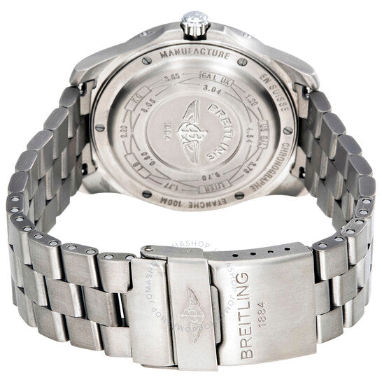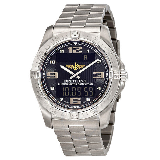 علبة من التيتانيوم مع سوار من التيتانيوم. إطار دوار أحادي الاتجاه من التيتانيوم. ميناء أسود بعقارب مضيئة وعلامات ساعات عربية مضيئة. علامات دقائق حول الحافة الخارجية. نوع الميناء: تناظري-رقمي. عقارب وعلامات مضيئة. تقويم دائم. شاشة رقمية. حركة كوارتز بريتلينغ كاليبر 79. زجاج ياقوت مقاوم للخدش والتوهج. تاج بدون براغي - حشوتان (تاج مدمج بزر ضغط. ميزان منقوش لتحويل الوزن). شكل العلبة دائري. حجم العلبة: 42 مم. سمك العلبة: 10.40 مم. عرض السوار: 22 مم. مشبك مزدوج قابل للطي. مقاومة للماء حتى عمق 100 متر / 330 قدمًا. الوظائف: تقويم دائم، تاريخ، يوم، ساعة، دقيقة، ثانية، كرونوغراف، منبه، مكرر دقائق رقمي، توقيت غرينتش، مؤقت تنازلي، مؤشر احتياطي الطاقة. معلومات إضافية: منبه، مؤقت تنازلي، مؤشر نهاية عمر البطارية، إضاءة خلفية للشاشة. طراز ساعة رياضية. علامة الساعة: صناعة سويسرية. إصدارات المنتج: E7936210/B962-130E. ساعة بريتلينغ إيروسبيس الرجالية التناظرية والرقمية E7936210-B962TI.