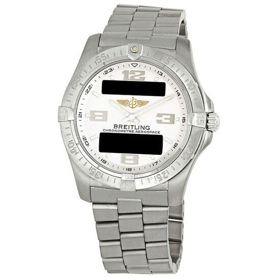 علبة من التيتانيوم مع سوار من التيتانيوم. إطار من التيتانيوم أحادي الاتجاه بمسامير. ميناء فضي بعقارب مضيئة. أرقام عربية تُشير إلى مواقع الساعات 3 و6 و9 و12. مقياس توقيت غرينتش حول الإطار الداخلي. شاشة عرض رقمية LCD إلكترونية - تقويم دائم. آلية حركة سوبر كوارتز. كريستال ياقوت مقاوم للخدش. غطاء خلفي صلب. قطر العلبة: 42 مم. سُمكها: 10.40 مم. مشبك قابل للطي. مقاومة للماء حتى عمق 100 متر/330 قدم. الوظائف: الساعات، الدقائق، الثواني، التقويم الدائم، مؤقت تنازلي، منطقة زمنية ثانية، منبه، مُكرر دقائق. معلومات إضافية: شاشة عرض رقمية LCD إلكترونية وتناظرية. ساعة بريتلينغ إيروسبيس للرجال بمينا فضي E7936210-G606TI.
