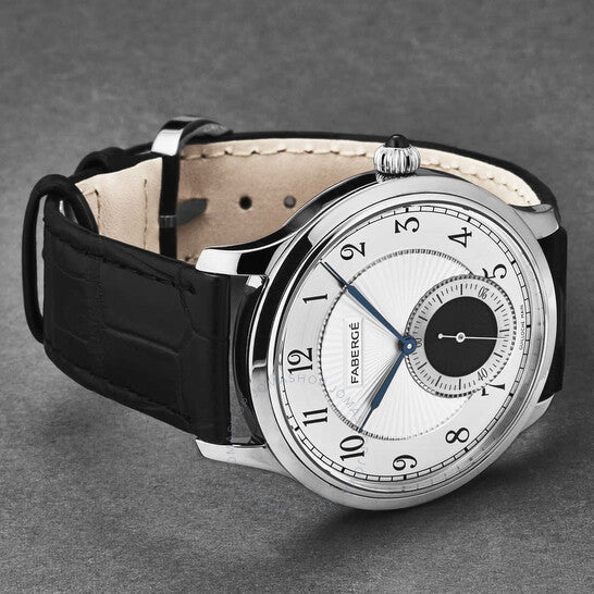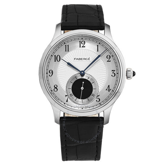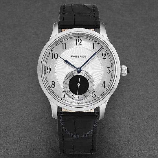 علبة من الذهب الأبيض عيار ١٨ قيراطًا مع سوار جلدي أسود. إطار ثابت من الذهب الأبيض عيار ١٨ قيراطًا. ميناء فضي اللون بعقارب زرقاء وعلامات ساعات بأرقام عربية. علامات دقائق حول الحافة الخارجية. نوع الميناء: تناظري. حركة أوتوماتيكية. زجاج ياقوت مقاوم للخدش. تاج قابل للسحب/الدفع. غطاء خلفي شفاف. شكل دائري، مقاس العلبة: ٤٠ مم، سمكها: ١٠ مم. عرض السوار: ٢٠ مم، طوله: ٨ بوصات. مشبك تانغ. مقاومة للماء حتى عمق ٥٠ مترًا / ١٦٥ قدمًا. الوظائف: الساعات، الدقائق، الثواني. معلومات إضافية: الساعات، الدقائق، الثواني. سلسلة أغاثون. تصميم فاخر. ساعة فابرجيه أغاثون أوتوماتيكية للرجال بمينا فضي FAB-215.