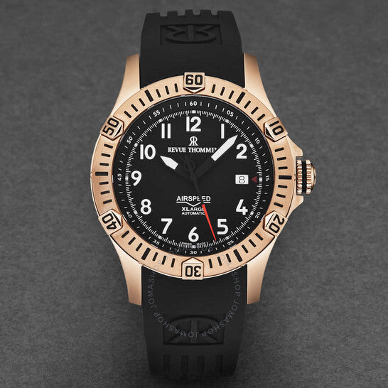 علبة من الفولاذ المقاوم للصدأ بلون الذهب الوردي مع سوار مطاطي أسود. إطار دوار أحادي الاتجاه من الفولاذ المقاوم للصدأ بلون الذهب الوردي. ميناء أسود بعقارب سوداء مضيئة وعلامات ساعات رقمية عربية. علامات دقائق رقمية عربية (بفاصل 5 دقائق). علامات دقائق حول الحافة الخارجية. نوع الميناء: تناظري. عقارب وعلامات مضيئة. عرض التاريخ عند موضع الساعة 3. حركة أوتوماتيكية من طراز Sellita Calibre SW221-1، تحتوي على 26 جوهرة، تنبض بمعدل 28800 ذبذبة في الساعة، ولديها احتياطي طاقة لمدة 38 ساعة تقريبًا. زجاج من الياقوت المقاوم للخدش. تاج لولبي. غطاء خلفي شفاف. شكل دائري، حجم العلبة: 43.5 مم، سمك العلبة: 13 مم. عرض السوار: 22 مم، طول السوار: 8 بوصات. مشبك قابل للطي بزر ضغط. مقاومة للماء حتى عمق 100 متر / 330 قدمًا. الوظائف: التاريخ، الساعة، الدقائق، الثواني. معلومات إضافية: الساعات، الدقائق، الثواني، التاريخ. سلسلة إير سبيد. تصميم كاجوال. علامة الساعة: صناعة سويسرية. ساعة ريفيو ثومين إير سبيد أوتوماتيكية للرجال بمينا أسود، رقم 16070.4767.