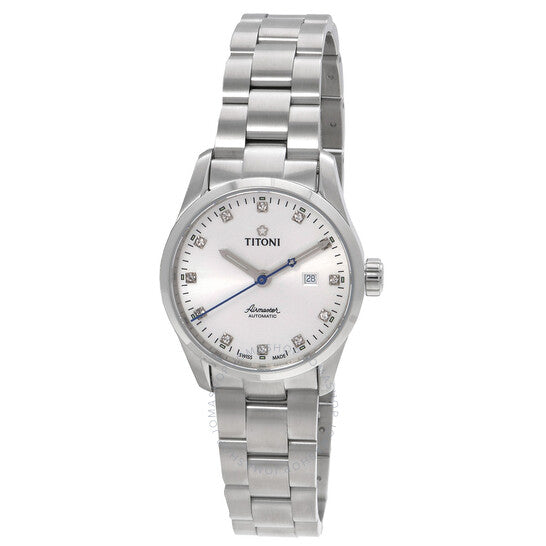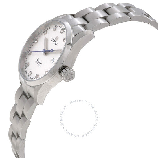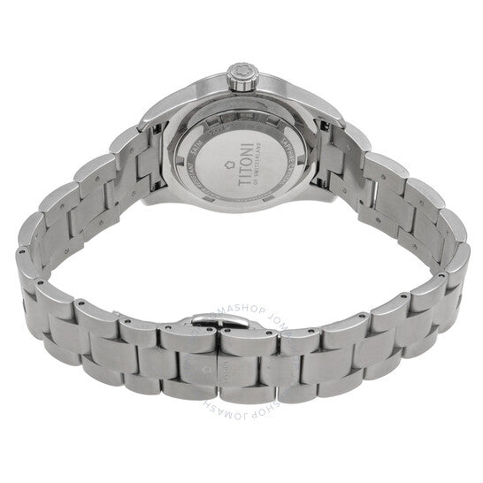 علبة وسوار من الفولاذ المقاوم للصدأ فضي اللون. إطار ثابت من الفولاذ المقاوم للصدأ فضي اللون. ميناء فضي مع عقارب فضية وزرقاء وعلامات ساعات حجرية. علامات دقائق حول الحافة الخارجية. نوع الميناء: تناظري. عرض التاريخ عند موضع الساعة 3. حركة أوتوماتيكية. زجاج ياقوت مقاوم للخدش. تاج قابل للسحب/الدفع. غطاء خلفي صلب. شكل دائري، مقاس العلبة: 29 مم. مشبك فراشة. مقاومة للماء حتى عمق 50 مترًا / 165 قدمًا. الوظائف: التاريخ، الساعة، الدقائق، الثواني. سلسلة إيرماستر. تصميم ساعة كاجوال. علامة الساعة: صناعة سويسرية. ساعة تيتوني إيرماستر أوتوماتيكية نسائية بمينا فضي 23743 S-581.