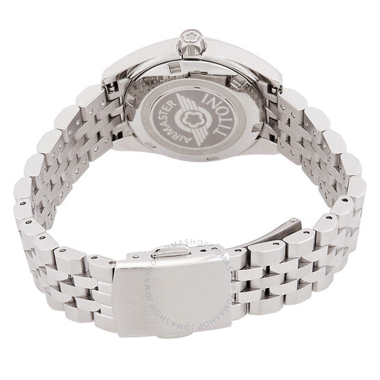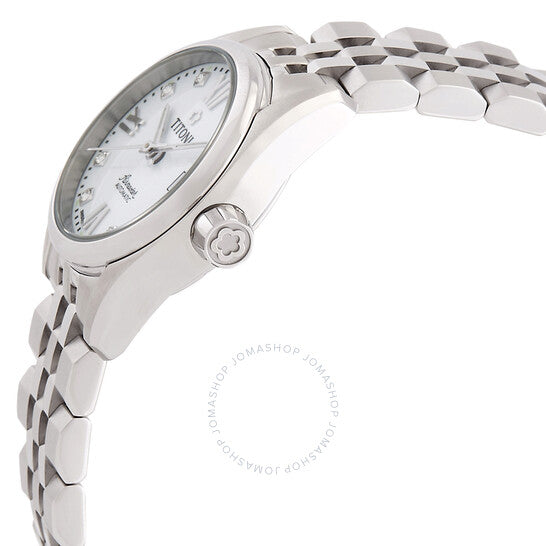 علبة وسوار من الفولاذ المقاوم للصدأ فضي اللون. إطار ثابت من الفولاذ المقاوم للصدأ فضي اللون. ميناء أبيض بعقارب فضية اللون وعلامات ساعات بأرقام رومانية. علامات دقائق حول الحافة الخارجية. نوع الميناء: تناظري. عرض التاريخ عند موضع الساعة 3. حركة أوتوماتيكية. زجاج ياقوت مقاوم للخدش. تاج قابل للسحب/الدفع. غطاء خلفي صلب. شكل العلبة دائري، مقاسها: 27 مم. مشبك قابل للطي مع مفتاح أمان. مقاومة للماء حتى عمق 50 مترًا / 165 قدمًا. الوظائف: التاريخ، الساعة، الدقائق، الثواني. سلسلة إيرماستر. تصميم ساعة كاجوال. علامة الساعة: صناعة سويسرية. ساعة تيتوني إيرماستر أوتوماتيكية نسائية بمينا أبيض 23909 S-063.