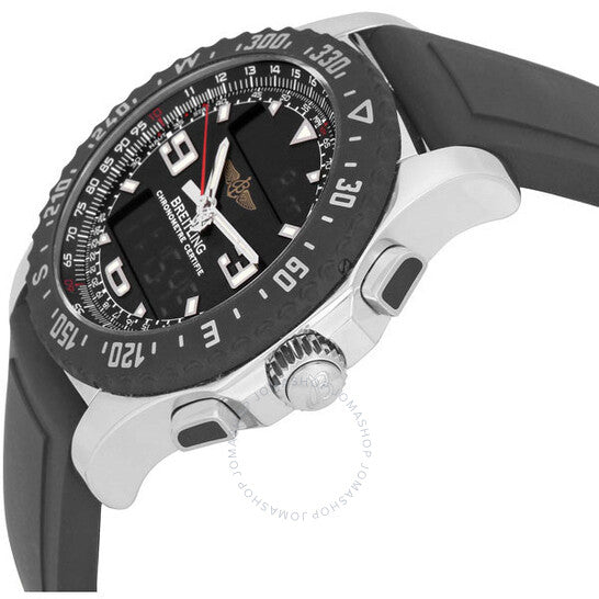 علبة فولاذية مع سوار غواص احترافي. ترس ثنائي الاتجاه مع مسطرة منزلقة وإطار بوصلة. ميناء أسود بعقارب مضيئة وعلامات ساعات على شكل عصا. أرقام عربية تُشير إلى الساعات 3 و6 و9. عقارب وعلامات مضيئة. ساعة رقمية دائمة. رقمية - 1/100 من الثانية، عد تنازلي، ومنطقة زمنية ثانية. آلية حركة سوبر كوارتز. كريستال ياقوت مقاوم للخدش. تاج مُغلق ببرغي. غطاء خلفي صلب. قطر العلبة: 43.50 مم. سُمكها: 16.70 مم. مشبك أوشن ريسر. مقاومة للماء حتى عمق 50 مترًا/165 قدمًا. الوظائف: الساعات، الدقائق، الثواني، التاريخ، المنبه، مؤقت العد التنازلي، منطقة زمنية ثانية. ساعة بريتلينغ إير وولف رافين للرجال A7836423-B9-134S.