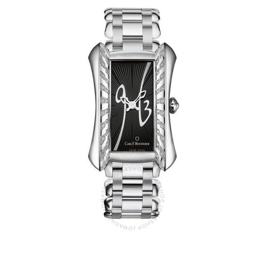علبة من الفولاذ المقاوم للصدأ فضية اللون مع سوار من الفولاذ المقاوم للصدأ فضي اللون. إطار ثابت مرصع بالألماس فضي اللون. ميناء أسود بعقارب فضية اللون. نوع الميناء: تناظري. حركة كوارتز ETA Caliber 256.031. زجاج ياقوت مقاوم للخدش. تاج قابل للسحب/الدفع. غطاء خلفي صلب. شكل فريد للعلبة، مقاس العلبة: 44 مم. مقاومة للماء حتى عمق 30 مترًا / 100 قدم. الوظائف: الساعات، الدقائق. سلسلة ألاكريا ديفا. تصميم ساعة فاخر. علامة الساعة: صناعة سويسرية. تنوعات المنتج: 366.495.5. ساعة كارل إف. بوخرير ألاكريا ديفا النسائية 00.10705.08.32.31.