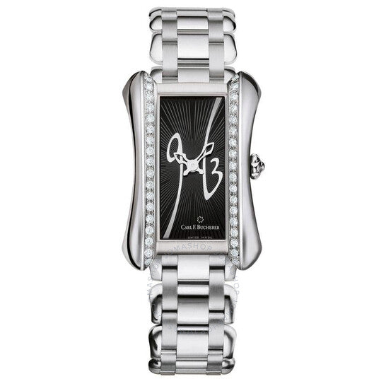 علبة من الفولاذ المقاوم للصدأ فضية اللون مع سوار فضي اللون. إطار ثابت مرصع بالألماس فضي اللون. ميناء أسود بعقارب فضية اللون وأرقام عربية عند علامتي الساعة الثالثة والتاسعة. نوع الميناء: تناظري. حركة كوارتز ETA Caliber 280.002. زجاج ياقوت مقاوم للخدش. تاج قابل للسحب/الدفع. شكل علبة فريد، مقاس العلبة: 40 مم × 28 مم. مقاومة للماء حتى عمق 30 مترًا / 100 قدم. الوظائف: الساعة، الدقائق. سلسلة ألاكريا. تصميم ساعة فاخر. علامة الساعة: صناعة سويسرية. تنوعات المنتج: 366.337.2. ساعة كارل إف. بوخرير ألاكريا النسائية 00.10701.08.32.31.