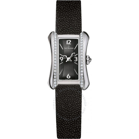 علبة من الفولاذ المقاوم للصدأ فضية اللون مع سوار من جلد الغالوشا الأسود. إطار ثابت من الفولاذ المقاوم للصدأ فضي اللون. ميناء أسود بعقارب فضية اللون وأرقام عربية للساعات. نوع الميناء: تناظري. حركة كوارتز. زجاج ياقوت مقاوم للخدش. تاج قابل للسحب/الدفع. شكل علبة فريد، مقاس العلبة: 38 مم × 26.5 مم، سمك العلبة: 7.4 مم. مقاومة للماء حتى عمق 30 مترًا / 100 قدم. الوظائف: الساعة، الدقائق. معلومات إضافية: علبة مرصعة بـ 38 ماسة. سلسلة ألاكريا. تصميم ساعة فاخر. علامة الساعة: صناعة سويسرية. تنوعات المنتج: 366.334.9. ساعة كارل إف. بوخرير ألاكريا النسائية 00.10701.08.36.11.