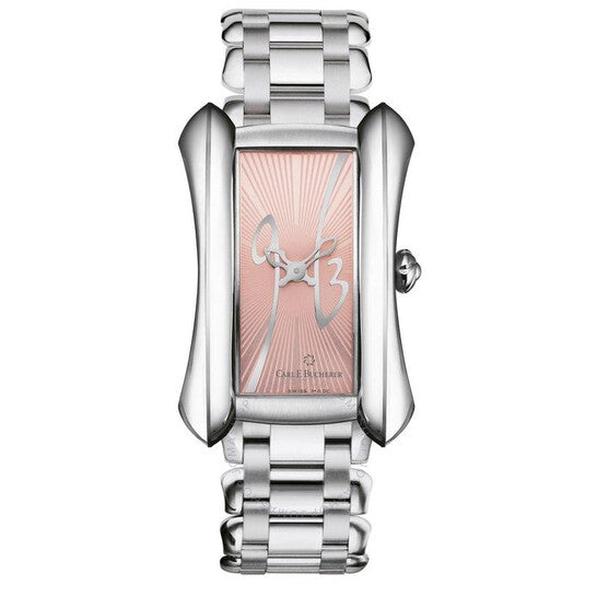 علبة فضية اللون من الفولاذ المقاوم للصدأ مع سوار فضي اللون. إطار ثابت فضي اللون من الفولاذ المقاوم للصدأ. ميناء وردي اللون مع عقارب فضية اللون ومؤشرات عربية عند الساعة 3 و9. نوع الميناء: تناظري. حركة كوارتز كارل إف. بوخرر كاليبر CFB 1852. زجاج ياقوت مقاوم للخدش. تاج قابل للسحب/الدفع. غطاء خلفي صلب. شكل فريد. حجم العلبة: 44 مم. مقاومة للماء حتى عمق 30 مترًا / 100 قدم. الوظائف: الساعات، الدقائق. تصميم ساعة فاخرة. علامة الساعة: صناعة سويسرية. تنوعات المنتج: 366.491.1. ساعة كارل إف. بوخرر ألاكريا النسائية 00.10705.08.92.21