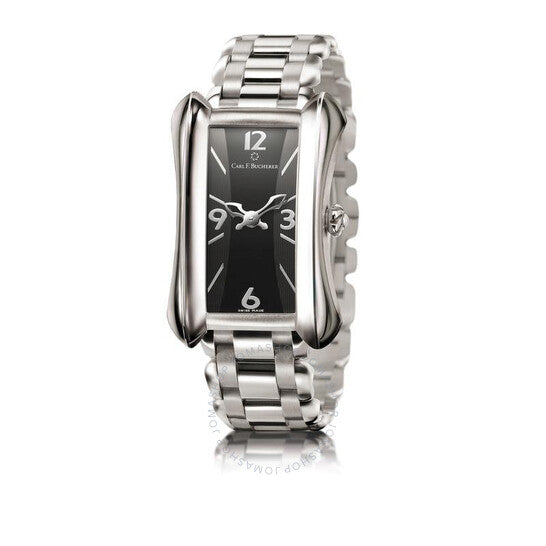علبة من الفولاذ المقاوم للصدأ فضية اللون مع سوار فضي اللون. إطار ثابت من الفولاذ المقاوم للصدأ فضي اللون. ميناء أسود بعقارب فضية اللون ومؤشرات ساعات بأرقام عربية. نوع الميناء: تناظري. حركة كوارتز. زجاج ياقوت مقاوم للخدش. تاج قابل للسحب/الدفع. شكل فريد للعلبة، مقاسها: 38 مم × 26.5 مم. مقاومة للماء حتى عمق 30 مترًا / 100 قدم. الوظائف: الساعة، الدقائق. سلسلة ألاكريا ميدي. تصميم ساعة فاخر. علامة الساعة: صناعة سويسرية. تنوعات المنتج: 366.329.2. ساعة كارل إف. بوخرير ألاكريا ميدي نسائية 00.10701.08.36.21.