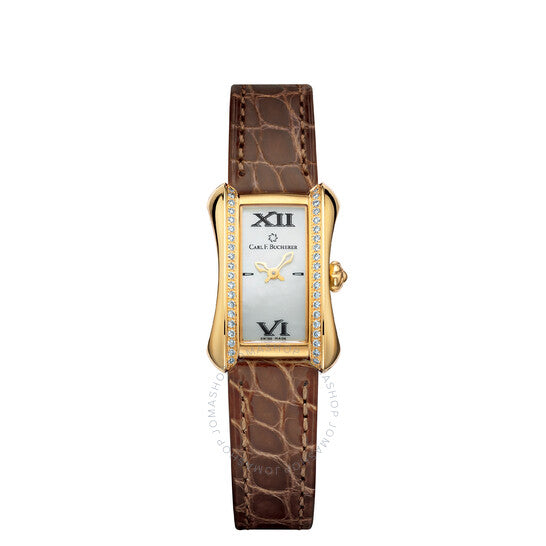 علبة من الذهب الأصفر عيار 18 قيراطًا مع سوار من جلد التمساح البني. إطار ثابت مرصع بالألماس. ميناء من عرق اللؤلؤ مع عقارب ذهبية اللون وأرقام رومانية عند علامتي الساعة 6 و12. نوع الميناء: تناظري. حركة كوارتز كارل إف. بوخرر كاليبر CFB 1850. زجاج ياقوت مقاوم للخدش. تاج قابل للسحب/الدفع. حجم العلبة: 21 مم × 30 مم. سمك العلبة: 6.2 مم. شكل العلبة فريد. مقاومة للماء حتى عمق 30 مترًا / 100 قدم. الوظائف: الساعة، الدقائق. معلومات إضافية: علبة مرصعة بـ 40 ماسة fc tw vvs 0.3 قيراط. طراز ساعة فاخر. علامة الساعة: صناعة سويسرية. تنوعات المنتج: 369.314.7. ساعة كارل إف. بوخرر ألاكريا برينسيس النسائية 00.10703.01.71.11.