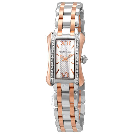 علبة من الذهب الوردي عيار ١٨ قيراطًا، مع سوار من الفولاذ المقاوم للصدأ بوصلات من الذهب الوردي عيار ١٨ قيراطًا. إطار ثابت من الفولاذ المقاوم للصدأ مرصع بالألماس. ميناء فضي اللون، بعقارب هيكلية بلون الذهب الوردي، وعلامات ساعات مؤشرة. أرقام رومانية عند موضعي الساعة ٦ و١٢. نوع الميناء: تناظري. حركة كوارتز كارل إف. بوخرر كاسيبر CFB ١٨٥٠. زجاج ياقوت مقاوم للخدش. تاج قابل للسحب/الدفع. غطاء خلفي صلب. شكل فريد. أبعاد العلبة: ٣٠ مم × ٢١ مم، سُمك العلبة: ٦.٢ مم. مشبك قابل للطي بزر ضغط. مقاومة للماء حتى عمق ٣٠ مترًا / ١٠٠ قدم. الوظائف: الساعات، الدقائق. سلسلة ألاكريا برينسيس. تصميم ساعة فاخر. علامة الساعة: صناعة سويسرية. تنوعات المنتج: ٣٦٦.٣٥٥.٤. ساعة كارل اف بوخرير الاكريا برينسيس ذات الميناء الفضي للسيدات 00.10703.07.15.31.