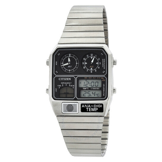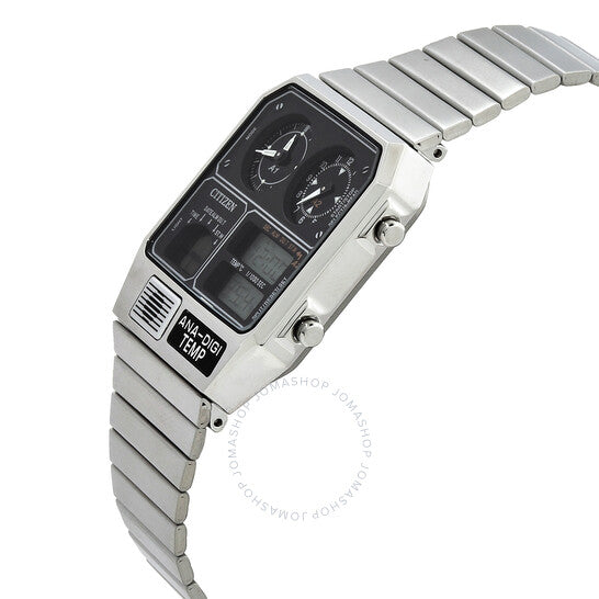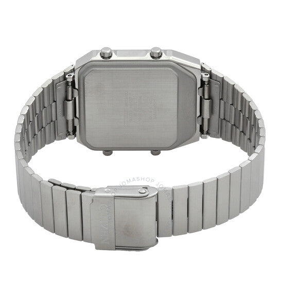 علبة وسوار من الفولاذ المقاوم للصدأ فضي اللون. إطار ثابت من الفولاذ المقاوم للصدأ فضي اللون. ميناء أسود بشاشة LCD مع عقارب مضيئة ومؤشرات ساعات بأرقام عربية. نوع الميناء: تناظري-رقمي. عقارب ومؤشرات مضيئة. حركة كوارتز سيتيزن كاليبر 8989. زجاج معدني مقاوم للخدش. غطاء خلفي صلب. شكل العلبة مربع، مقاسها: 31 مم، سمكها: 8 مم. مشبك منزلق. مقاومة للماء حتى عمق 50 مترًا / 165 قدمًا. الوظائف: عرض كرونوغراف، منبه، ساعة إيقاف، درجة الحرارة، عرض اليوم/التاريخ، وقت مزدوج. سلسلة كرونوغراف. طراز الساعة الرياضية. علامة الساعة: Japan Movt. ساعة سيتيزن كرونوغراف كوارتز تناظرية-رقمية نسائية JG2101-78E.