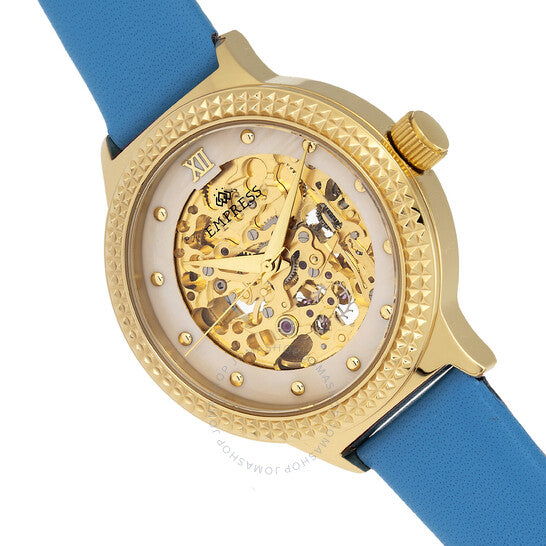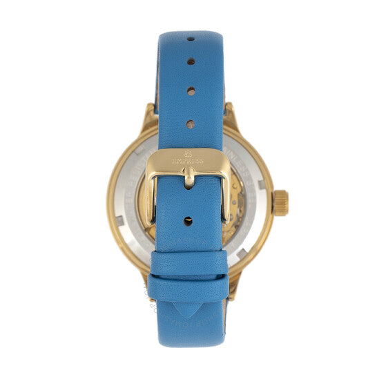 علبة من الفولاذ المقاوم للصدأ بلون ذهبي مع سوار من الجلد الأصلي باللون الأزرق. إطار ثابت من الفولاذ المقاوم للصدأ بلون ذهبي. ميناء أبيض بعقارب ذهبية اللون وأرقام رومانية وعلامات ساعات. نوع الميناء: تناظري. حركة أوتوماتيكية باحتياطي طاقة لمدة 32 ساعة. زجاج معدني مقاوم للخدش. تاج قابل للسحب/الدفع. غطاء خلفي شفاف. شكل العلبة دائري، مقاسها: 38 مم، سمكها: 12 مم. عرض السوار: 16 مم. مشبك بإبزيم. مقاومة للماء حتى عمق 50 مترًا / 165 قدمًا. الوظائف: الساعات، الدقائق، الثواني. طراز ساعة رسمية. علامة الساعة: Japan Movt. متغيرات المنتج: EMPEM3204. ساعة Empress Alice أوتوماتيكية نسائية بمينا أبيض EMPEM3204.