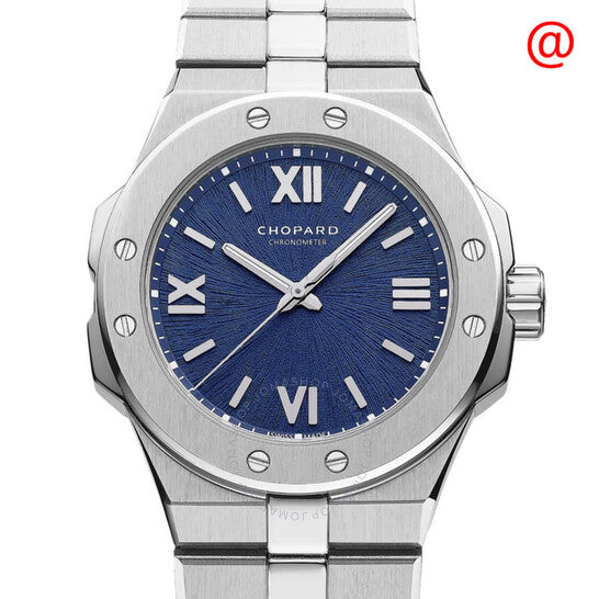 علبة وسوار من الفولاذ المقاوم للصدأ فضي اللون. إطار ثابت من الفولاذ المقاوم للصدأ فضي اللون. ميناء أزرق مع عقارب فضية اللون وعلامات ساعات رومانية. علامات دقائق حول الحافة الخارجية. نوع الميناء: تناظري. عقارب وعلامات مضيئة. حركة أوتوماتيكية. زجاج ياقوت مقاوم للخدش. علبة دائرية الشكل، مقاسها: 33 مم. مشبك قابل للطي مع مفتاح أمان. الوظائف: الساعات، الدقائق، الثواني. معلومات إضافية: العلبة الأصلية، بطاقة ضمان دولية، دليل الاستخدام (ملحقات كاملة). سلسلة ألباين إيجل. تصميم ساعة فاخرة. ملصق الساعة: صناعة سويسرية. ساعة شوبارد ألباين إيجل أوتوماتيكية نسائية بمينا أزرق، رقمها 298617 3001.