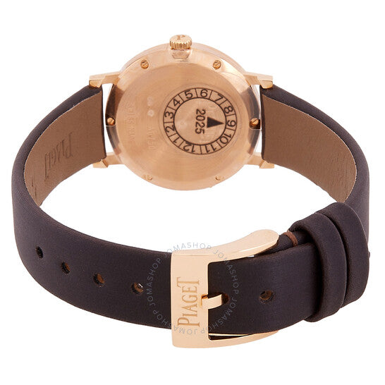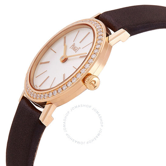 علبة من الذهب الوردي عيار ١٨ قيراطًا مع سوار ساتان بني. إطار ثابت من الذهب الوردي عيار ١٨ قيراطًا مرصع بـ ٤٨ ماسة بقطع بريانت (حوالي ٠.٣٥ قيراط). ميناء أبيض مع عقارب ومؤشرات ساعات باللون الذهبي الوردي. نوع الميناء: تناظري. حركة كوارتز بياجيه كاليبر ٦٩٠P. زجاج ياقوت مقاوم للخدش. تاج قابل للسحب/الدفع. غطاء خلفي صلب. شكل العلبة دائري، مقاسها: ٢٤ مم، سمكها: ٥.٤ مم. مشبك أرديلون. مقاومة للماء حتى عمق ٣٠ مترًا / ١٠٠ قدم. الوظائف: الساعات، الدقائق. سلسلة ألتيبلانو. تصميم ساعة فاخرة. ساعة بياجيه ألتيبلانو كوارتز نسائية بمينا بيضاء مرصعة بالألماس G0A44534.
