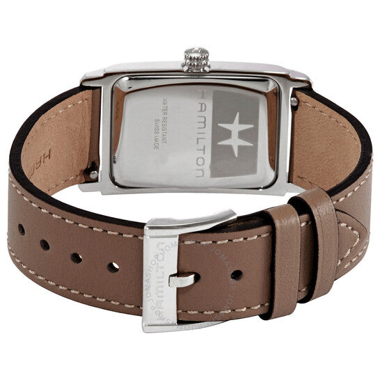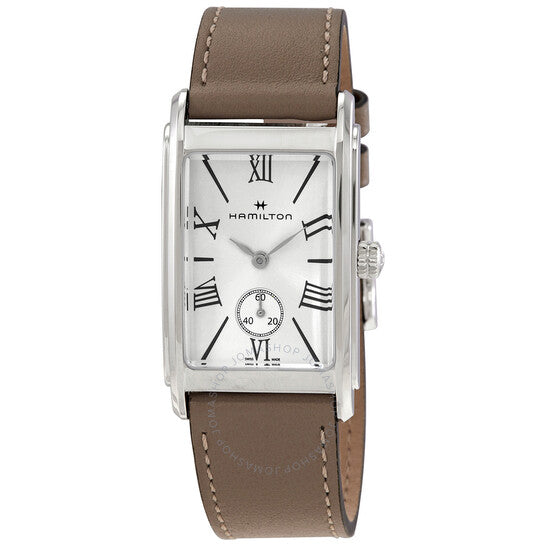 علبة من الفولاذ المقاوم للصدأ مع سوار جلدي بني. إطار ثابت من الفولاذ المقاوم للصدأ. ميناء فضي اللون بعقارب فضية اللون وأرقام رومانية متناوبة وعلامات ساعات. نوع الميناء: تناظري. ميناء فرعي للثواني الصغيرة. حركة كوارتز عيار ETA 980.163. زجاج معدني مقاوم للخدش. تاج قابل للسحب/الدفع. غطاء خلفي صلب. شكل مستطيل. أبعاد العلبة: 23.4 مم × 32 مم. سمك العلبة: 7 مم. مشبك تانغ. مقاومة للماء حتى عمق 30 مترًا / 100 قدم. الوظائف: الساعات، الدقائق، الثواني الصغيرة. سلسلة أردمور الأمريكية الكلاسيكية. تصميم كاجوال. ساعة هاميلتون الأمريكية الكلاسيكية أردمور النسائية H11421514.