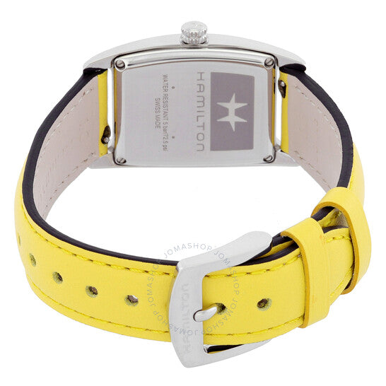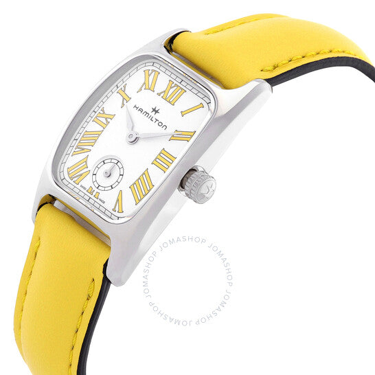 علبة من الفولاذ المقاوم للصدأ فضية اللون مع سوار جلدي أصفر. إطار ثابت من الفولاذ المقاوم للصدأ فضي اللون. ميناء أبيض بعقارب فضية اللون وعلامات ساعات رومانية. علامات دقائق حول الحافة الخارجية. نوع الميناء: تناظري. ميناء فرعي واحد يعرض الثواني الصغيرة. حركة كوارتز ETA Caliber 980.163. زجاج ياقوتي مقاوم للخدش. غطاء خلفي صلب. شكل العلبة: تونيو، أبعادها: 23.5 مم × 27.40 مم، سُمكها: 8.64 مم. عرض السوار: 16 مم. مشبك بإبزيم. مقاومة للماء حتى عمق 50 مترًا / 165 قدمًا. الوظائف: الساعات، الدقائق، الثواني الصغيرة. سلسلة أمريكان كلاسيك. تصميم كاجوال. علامة الساعة: صناعة سويسرية. ساعة هاميلتون أمريكان كلاسيك كوارتز نسائية بمينا بيضاء H13321812.