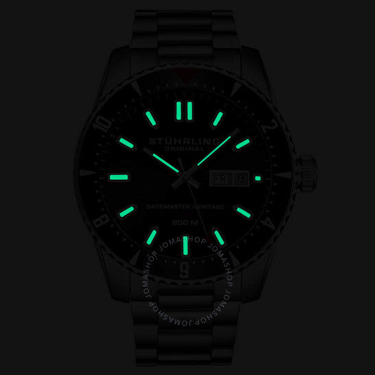 علبة وسوار من الفولاذ المقاوم للصدأ فضي اللون. إطار دوار أحادي الاتجاه من الفولاذ المقاوم للصدأ أسود اللون. ميناء أسود بعقارب وعلامات ساعات فضية اللون. علامات دقائق حول الحافة الخارجية. نوع الميناء: تناظري. عقارب وعلامات مضيئة. عرض يوم الأسبوع والتاريخ عند موضع الساعة 3. آلية حركة أوتوماتيكية. زجاج معدني مقاوم للخدش. تاج لولبي. غطاء خلفي شفاف. شكل العلبة دائري، مقاس العلبة: 44 مم، سمكها: 16 مم. عرض السوار: 22 مم، طوله: 7.5 بوصة. مشبك قابل للطي مع مفتاح أمان. مقاومة للماء حتى عمق 200 متر / 660 قدمًا. الوظائف: التاريخ، اليوم، الساعة، الدقيقة، الثانية. سلسلة أكودايفر. طراز ساعة الغوص. ساعة ستورلينغ أوريجينال أكودايفر أوتوماتيكية للرجال بمينا أسود، طراز M16769.