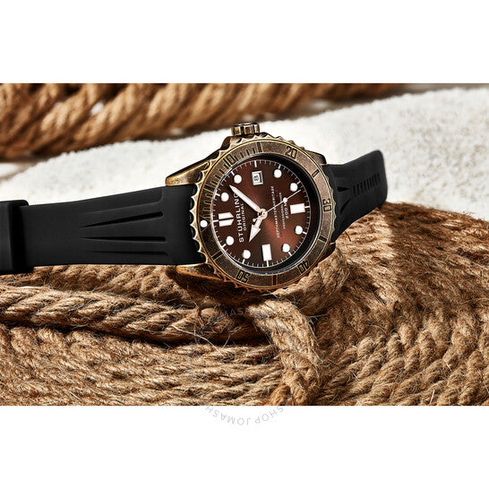 علبة من الفولاذ المقاوم للصدأ بلون الرصاصي مع سوار مطاطي أسود. إطار دوار أحادي الاتجاه من الفولاذ المقاوم للصدأ بلون الرصاصي. ميناء بني مع عقارب وعلامات ساعات ذهبية وردية. علامات دقائق حول الحافة الخارجية. نوع الميناء: تناظري. عقارب وعلامات مضيئة. عرض التاريخ عند موضع الساعة 3. حركة أوتوماتيكية. زجاج معدني مقاوم للخدش. تاج لولبي. غطاء خلفي صلب. شكل دائري، مقاس العلبة: 44 مم، سمكها: 14 مم. عرض السوار: 22 مم، طوله: 8.5 بوصة. مشبك بإبزيم. مقاومة للماء حتى عمق 200 متر / 660 قدمًا. الوظائف: التاريخ، الساعة، الدقائق، الثواني. سلسلة أكواديفر. طراز ساعة الغوص. ساعة ستورلينغ أوريجينال أكواديفر أوتوماتيكية للرجال بمينا بني، طراز M16858.