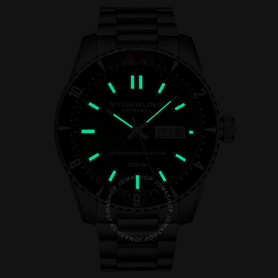 علبة وسوار من الفولاذ المقاوم للصدأ فضي اللون. إطار دوار أحادي الاتجاه من الفولاذ المقاوم للصدأ فضي اللون. ميناء أخضر مع عقارب وعلامات ساعات فضية اللون. علامات دقائق حول الحافة الخارجية. نوع الميناء: تناظري. عقارب وعلامات مضيئة. عرض يوم الأسبوع والتاريخ عند موضع الساعة 3. حركة أوتوماتيكية. زجاج معدني مقاوم للخدش. تاج لولبي. غطاء خلفي شفاف. شكل دائري، مقاس العلبة: 44 مم، سمكها: 16 مم. عرض السوار: 22 مم، طوله: 7.5 بوصة. مشبك قابل للطي مع مفتاح أمان. مقاومة للماء حتى عمق 200 متر / 660 قدمًا. الوظائف: التاريخ، اليوم، الساعة، الدقيقة، الثانية. سلسلة أكودايفر. طراز ساعة الغوص. ساعة ستورلينغ أوريجينال أكودايفر أوتوماتيكية للرجال بمينا أخضر M16761.