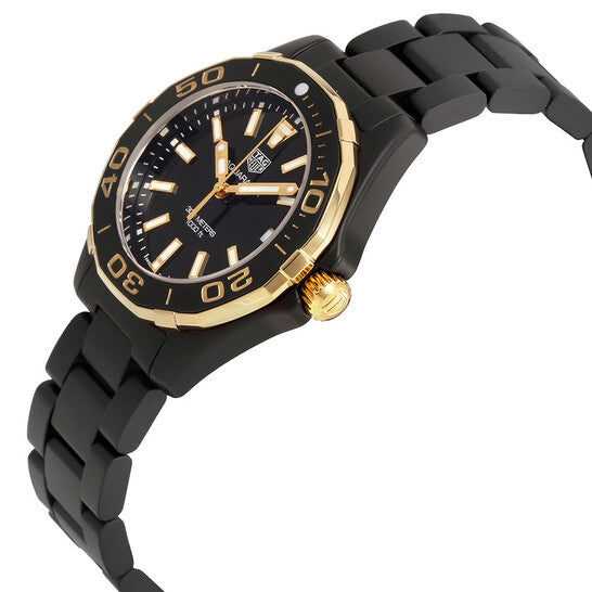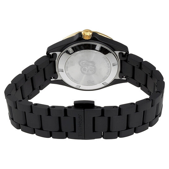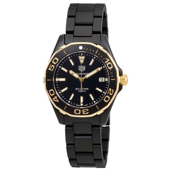 علبة من السيراميك الأسود مع سوار من السيراميك الأسود. إطار دوار أحادي الاتجاه مطلي بالذهب مع حلقة علوية من السيراميك الأسود. ميناء أسود بعقارب ومؤشرات ساعات ذهبية مضيئة. مؤشرات دقائق حول الحافة الخارجية. نوع الميناء: تناظري. عقارب ومؤشرات مضيئة. عرض التاريخ عند موضع الساعة 3. حركة كوارتز. زجاج ياقوتي مقاوم للخدش. تاج لولبي. غطاء خلفي صلب. حجم العلبة: 35 مم. شكل العلبة اثني عشري الأضلاع. مشبك قابل للطي. مقاومة للماء حتى عمق 300 متر / 1000 قدم. الوظائف: التاريخ، الساعة، الدقيقة، الثانية. تصميم ساعة فاخرة. علامة الساعة: صناعة سويسرية. ساعة تاغ هوير أكواريسر نسائية بمينا أسود وسيراميك أسود، WAY1321.BH0743.