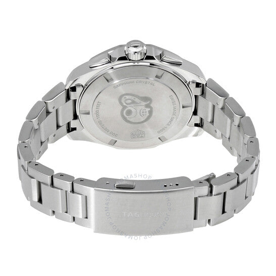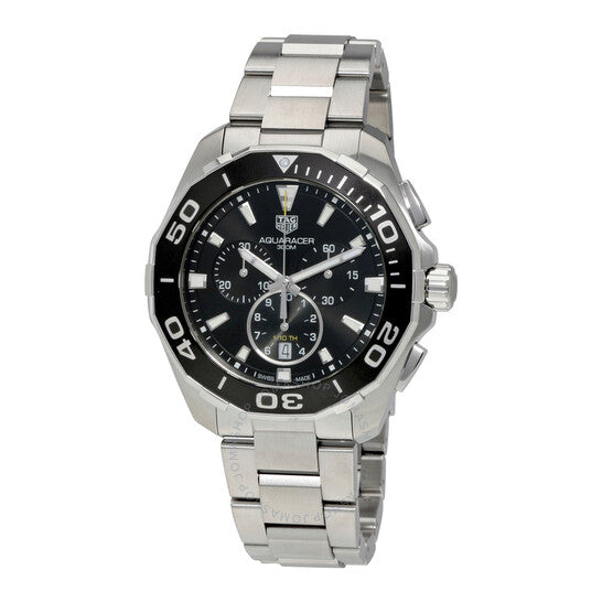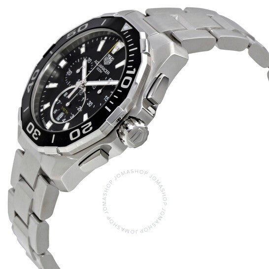 علبة من الفولاذ المقاوم للصدأ مع سوار من الفولاذ المقاوم للصدأ. إطار دوار أحادي الاتجاه من الفولاذ المقاوم للصدأ مع حلقة ألومنيوم سوداء مرصعة. ميناء أسود بعقارب ومؤشرات ساعات فضية مضيئة. مؤشرات دقائق حول الحافة الخارجية. نوع الميناء: تناظري. عقارب ومؤشرات مضيئة. عرض التاريخ عند موضع الساعة السادسة. كرونوغراف - ثلاثة موانئ فرعية تعرض: 60 ثانية، 30 دقيقة، و1/10 من الثانية. حركة كوارتز. زجاج ياقوت مقاوم للخدش. تاج لولبي. غطاء خلفي صلب. حجم العلبة: 43 مم. سمكها: 15 مم. شكل العلبة: اثنا عشري الأضلاع. عرض السوار: 20 مم. مشبك قابل للطي مع مفتاح أمان. مقاومة للماء حتى عمق 300 متر / 1000 قدم. تصميم كاجوال. ساعة تاغ هوير أكواريسر كرونوغراف للرجال بمينا سوداء، طراز CAY111A.BA0927.
