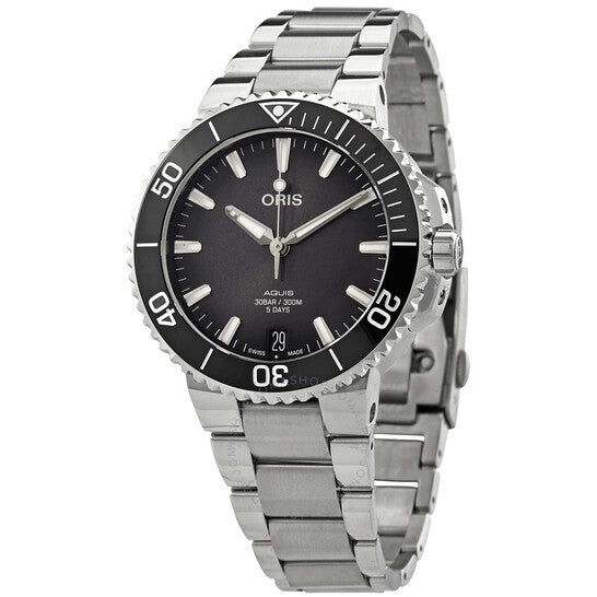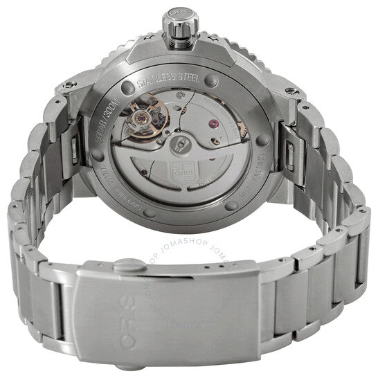 علبة من الفولاذ المقاوم للصدأ مع سوار من الفولاذ المقاوم للصدأ. إطار دوار أحادي الاتجاه من الفولاذ المقاوم للصدأ مع حلقة سيراميك سوداء مرصعة. ميناء أسود بعقارب ومؤشرات ساعات فضية مضيئة. مؤشرات دقائق حول الحافة الخارجية. نوع الميناء: تناظري. عقارب ومؤشرات مضيئة. عرض التاريخ عند موضع الساعة السادسة. حركة أوريس أوتوماتيكية كاليبر 400، تحتوي على 21 جوهرة، تنبض بمعدل 28800 ذبذبة في الساعة، ولديها احتياطي طاقة يصل إلى حوالي 120 ساعة. زجاج من الياقوت المقاوم للخدش. تاج لولبي. غطاء خلفي شفاف. شكل دائري. حجم العلبة: 41.5 مم. عرض السوار: 22 مم. مشبك قابل للطي مع مفتاح أمان. مقاومة للماء حتى عمق 300 متر / 1000 قدم. الوظائف: التاريخ، الساعة، الدقائق، الثواني. سلسلة Aquis. تصميم ساعة كاجوال. علامة الساعة: صناعة سويسرية. ساعة أوريس أكويس أوتوماتيكية للرجال بمينا أسود 01 400 7769 4154-07 8 22 09PEB.