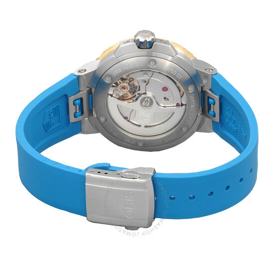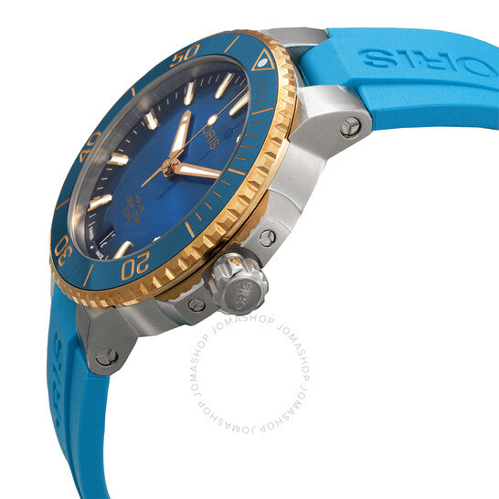 علبة فضية اللون من الفولاذ المقاوم للصدأ مع سوار مطاطي أزرق. إطار دوار أحادي الاتجاه من السيراميك الأزرق. ميناء أزرق مع عقارب وعلامات ساعات ذهبية اللون. علامات دقائق حول الحافة الخارجية. نوع الميناء: تناظري. عقارب وعلامات مضيئة. عرض التاريخ عند موضع الساعة السادسة. آلية حركة أوتوماتيكية. زجاج ياقوت مقاوم للخدش. تاج لولبي. غطاء خلفي شفاف. شكل العلبة دائري، مقاسها: 41.5 مم. إبزيم قابل للطي بزر ضغط للفتح. مقاومة للماء حتى عمق 300 متر / 1000 قدم. الوظائف: التاريخ، الساعة، الدقيقة، الثانية. سلسلة Aquis. طراز ساعة الغوص. علامة الساعة: صناعة سويسرية. ساعة Oris Aquis أوتوماتيكية للرجال بمينا أزرق 01 400 7769 6355-07 4 22 75FC.