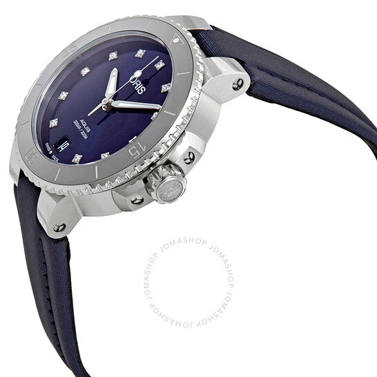 علبة من الفولاذ المقاوم للصدأ فضية اللون مع سوار قماشي أزرق. إطار دوار أحادي الاتجاه من الفولاذ المقاوم للصدأ فضي اللون. ميناء أزرق مع عقارب فضية اللون وعلامات ساعات مرصعة بالألماس. نوع الميناء: تناظري. عقارب مضيئة. عرض التاريخ عند موضع الساعة السادسة. حركة أوريس أوتوماتيكية عيار 733، قاعدة SW 200-1، مع احتياطي طاقة لمدة 38 ساعة. زجاج من الياقوت المقاوم للخدش. تاج لولبي. غطاء خلفي شفاف. شكل دائري. حجم العلبة: 36.50 مم. عرض السوار: 18 مم. مشبك قابل للطي. مقاومة للماء حتى عمق 300 متر / 1000 قدم. الوظائف: التاريخ، الساعة، الدقيقة، الثانية. طراز ساعة رسمية. علامة الساعة: صناعة سويسرية. ساعة أوريس أكويس أوتوماتيكية نسائية بمينا زرقاء مرصعة بالألماس، 01 733 7731 4195-07 5 18 46FC.