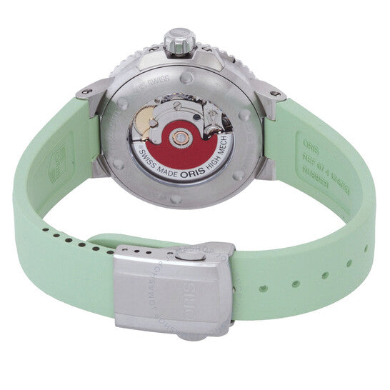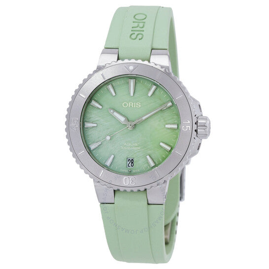 علبة من الفولاذ المقاوم للصدأ فضية اللون مع سوار مطاطي أخضر. إطار من الفولاذ المقاوم للصدأ فضي اللون. ميناء أخضر مع عقارب وعلامات ساعات فضية اللون. علامات دقائق حول الحافة الخارجية. نوع الميناء: تناظري. عقارب وعلامات مضيئة. عرض التاريخ عند موضع الساعة السادسة. عيار أوريس 733، قاعدة SW 200-1، حركة أوتوماتيكية، مبنية على SW 200-1، تحتوي على 26 جوهرة، تنبض بمعدل 28800 ذبذبة في الساعة، ولديها احتياطي طاقة لمدة 38 ساعة تقريبًا. زجاج ياقوت مقاوم للخدش. تاج لولبي. غطاء خلفي شفاف. شكل العلبة دائري، مقاسها: 36.5 مم. مقاومة للماء حتى عمق 300 متر / 1000 قدم. الوظائف: التاريخ، الساعة، الدقائق، الثواني. سلسلة Aquis. طراز ساعة الغوص. علامة الساعة: صناعة سويسرية. ساعة أوريس أكويس أوتوماتيكية للسيدات بمينا أخضر 01 733 7770 4157-07 4 18 67FC.