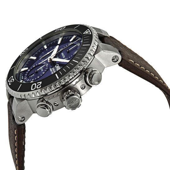 علبة فضية اللون من الفولاذ المقاوم للصدأ مع سوار جلدي بني داكن. إطار دوار أحادي الاتجاه من السيراميك الأسود. ميناء أزرق مع عقارب وعلامات ساعات فضية اللون. علامات دقائق حول الحافة الخارجية. نوع الميناء: تناظري. عقارب وعلامات مضيئة. عرض التاريخ عند موضع الساعة السادسة. كرونوغراف - ثلاثة أقراص فرعية تعرض: 60 ثانية، 30 دقيقة، و12 ساعة. حركة أوريس كاليبر 774، قاعدة SW 500 أوتوماتيكية، تحتوي على 25 جوهرة، تنبض بمعدل 28800 ذبذبة في الساعة، ولديها احتياطي طاقة لمدة 48 ساعة تقريبًا. كريستال ياقوت مقاوم للخدش. تاج لولبي. غطاء خلفي صلب. شكل دائري، حجم العلبة: 45.50 مم. عرض السوار: 24 مم. مشبك قابل للطي. مقاومة للماء حتى عمق 500 متر / 1650 قدمًا. الوظائف: كرونوغراف، تاريخ، ساعة، دقيقة، ثانية. سلسلة Aquis. طراز ساعة الغوص. علامة الساعة: صناعة سويسرية. ساعة أوريس أكويس كرونوغراف أوتوماتيكية للرجال بمينا أزرق، 01 774 7743 4155-07 5 24 10EB.