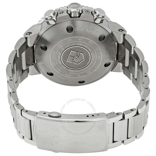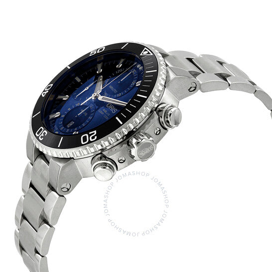 علبة وسوار من الفولاذ المقاوم للصدأ فضي اللون. دوار أحادي الاتجاه من الفولاذ المقاوم للصدأ فضي اللون مع إطار دائري من السيراميك الأسود. مينا أزرق مع عقارب وعلامات ساعات فضية مضيئة. علامات دقائق حول الحافة الخارجية. نوع المينا: تناظري. عقارب وعلامات مضيئة. عرض التاريخ فوق موضع الساعة السادسة. كرونوغراف - ثلاثة موانئ فرعية تعرض: ٦٠ ثانية، ٣٠ دقيقة، و١٢ ساعة. حركة أوريس ٧٧٤، قاعدة SW ٥٠٠ أوتوماتيكية مع احتياطي طاقة ٤٨ ساعة. زجاج ياقوت مقاوم للخدش. تاج لولبي. غطاء خلفي شفاف. شكل العلبة دائري، مقاسها: ٤٥.٥٠ مم. عرض السوار: ٢٤ مم. مشبك قابل للطي بزر ضغط. مقاومة للماء حتى عمق ٥٠٠ متر / ١٦٥٠ قدمًا. الوظائف: كرونوغراف، تاريخ، ساعة، دقيقة، ثانية. سلسلة Aquis. طراز ساعة الغوص. علامة الساعة: سويسرية الصنع. ساعة أوريس أكويس كرونوغراف أوتوماتيكية للرجال بمينا أزرق 01 774 7743 4155-07 8 24 05PEB.