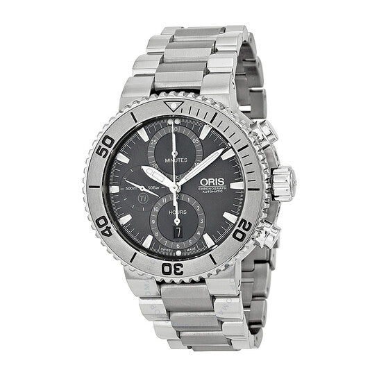 علبة من التيتانيوم مع سوار من التيتانيوم. إطار من التنغستن. ميناء رمادي مع عقارب ومؤشرات ساعات فضية مضيئة. مؤشرات دقائق حول الحافة الخارجية. نوع الميناء: تناظري. عقارب ومؤشرات مضيئة. عرض التاريخ عند موضع الساعة السادسة. كرونوغراف - ثلاثة موانئ فرعية تعرض: ٦٠ ثانية، ٣٠ دقيقة، وعُشر الثانية. حركة أوتوماتيكية مع احتياطي طاقة لمدة ٤٨ ساعة. كريستال ياقوت مقاوم للخدش. تاج لولبي. غطاء خلفي صلب. حجم العلبة: ٤٦ مم. سُمكها: ١٣ مم. شكلها دائري. عرض السوار: ٢٦ مم. طول السوار: ٨.٥ بوصة. مشبك قابل للطي بزر ضغط. مقاومة للماء حتى عمق ٥٠٠ متر / ١٦٥٠ قدمًا. الوظائف: كرونوغراف، تاريخ، ساعة، دقيقة، ثانية. تصميم كاجوال. علامة الساعة: صناعة سويسرية. ساعة أوريس أكويس كرونوغراف بمينا رمادي للرجال 01 674 7655 7253-07 8 26 75PEB.