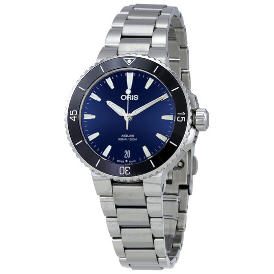 علبة من الفولاذ المقاوم للصدأ فضية اللون مع سوار فضي اللون. حافة دوارة أحادية الاتجاه من الفولاذ المقاوم للصدأ فضية اللون مع إطار سيراميك أسود. ميناء أزرق مع عقارب وعلامات ساعات فضية مضيئة. علامات دقائق حول الحافة الخارجية. نوع الميناء: تناظري. عقارب وعلامات مضيئة. عرض التاريخ عند موضع الساعة السادسة. حركة أوريس كاليبر 733 أوتوماتيكية، مبنية على سيليتا SW200-1، تحتوي على 26 جوهرة، تنبض بمعدل 28800 ذبذبة في الساعة، ولديها احتياطي طاقة لمدة 38 ساعة تقريبًا. زجاج ياقوت مقاوم للخدش. تاج لولبي. غطاء خلفي شفاف. شكل العلبة دائري، حجم العلبة: 36.5 مم، سمك العلبة: 11.9 مم. عرض السوار: 18 مم. مشبك قابل للطي. مقاومة للماء حتى عمق 300 متر / 1000 قدم. الوظائف: التاريخ، الساعة، الدقائق، الثواني. سلسلة Aquis Date. طراز ساعة الغوص. ملصق الساعة: صناعة سويسرية. ساعة أوريس أكويس ديت أوتوماتيكية بمينا أزرق للسيدات 01 733 7731 4135-07 8 18 05P.